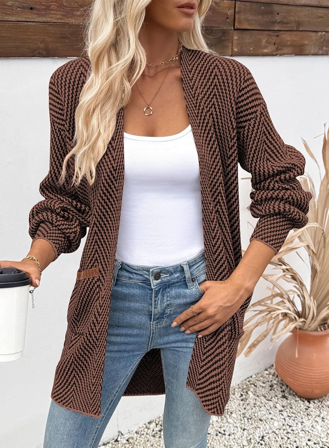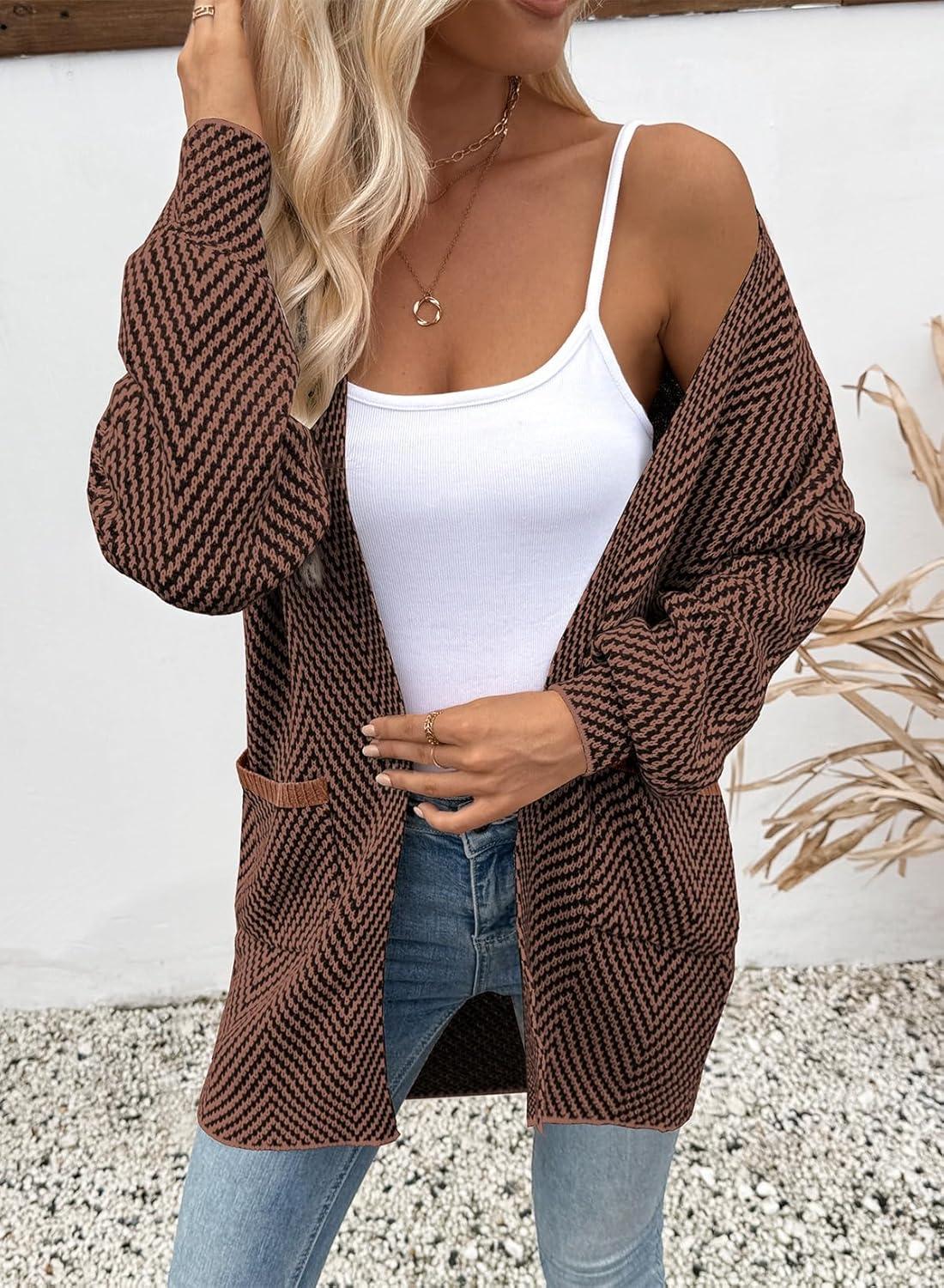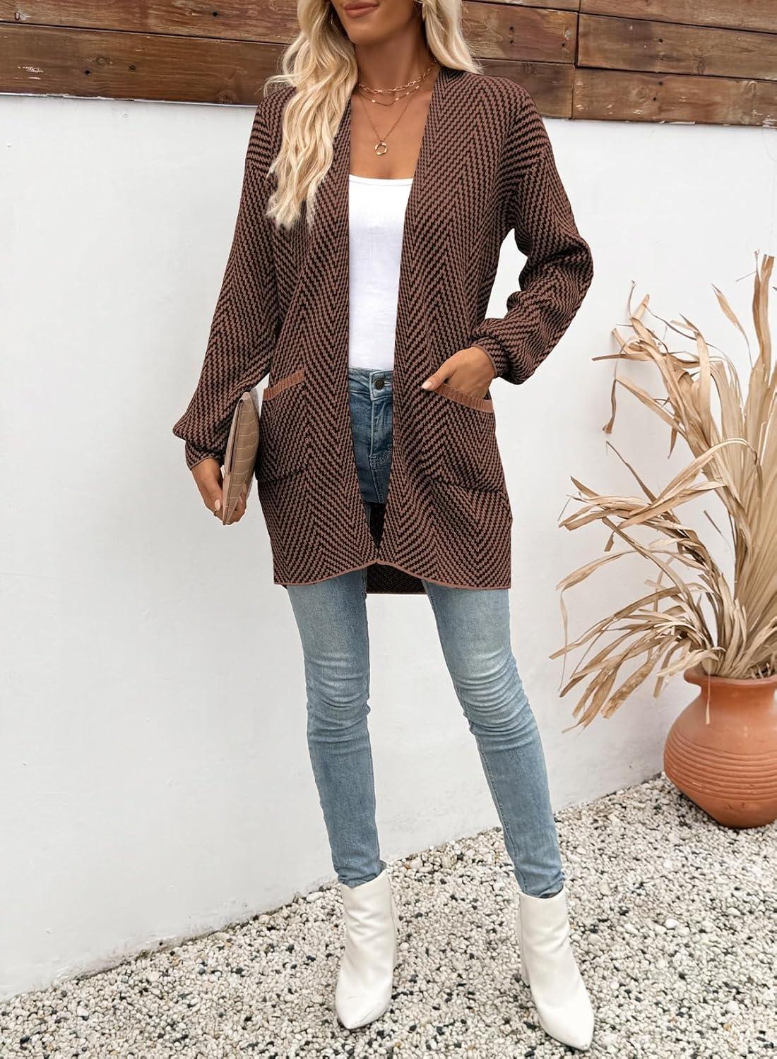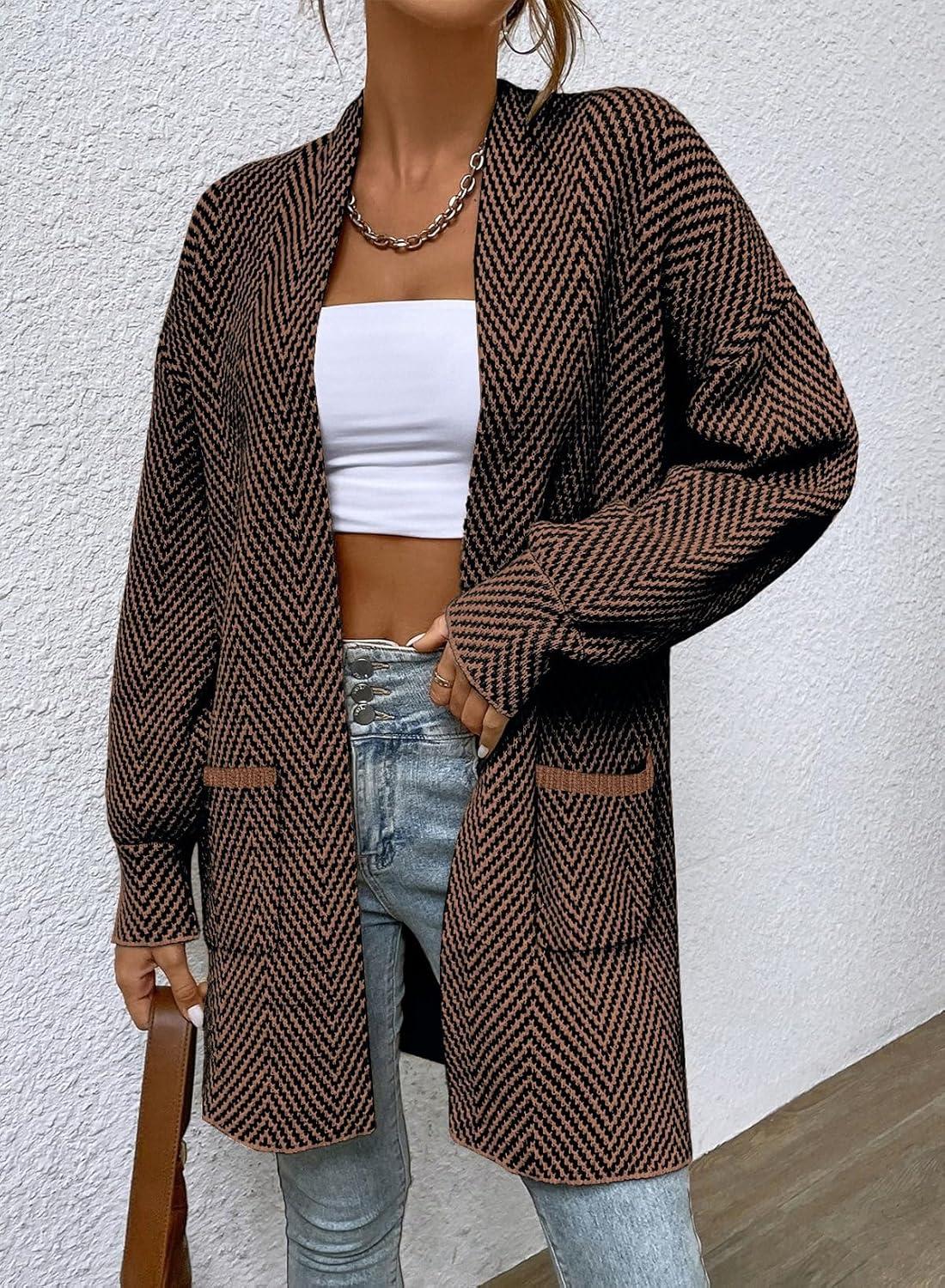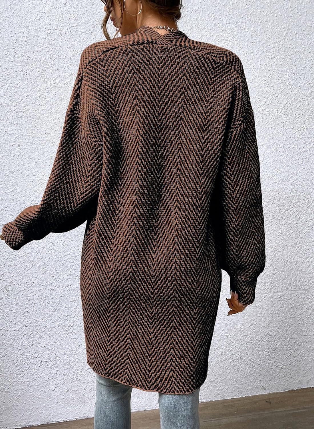 Sidefeel Womens 2025 Fall Outfits Long Sleeve Open Front Striped Cardigan Sweaters Chevron Chunky Knit Sweaters Coat(Brown)