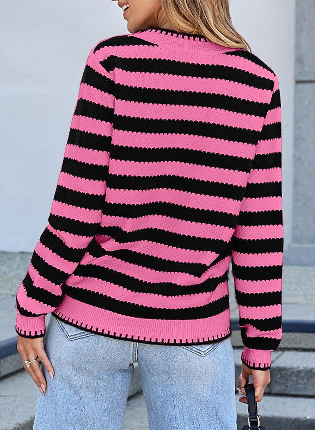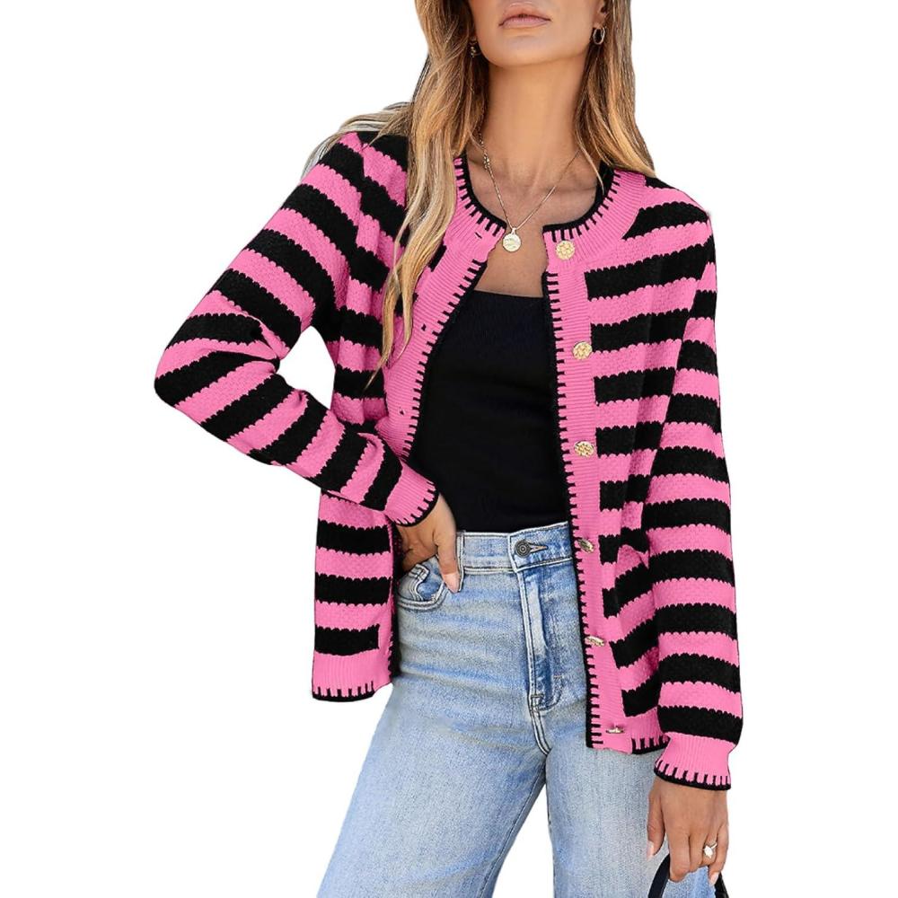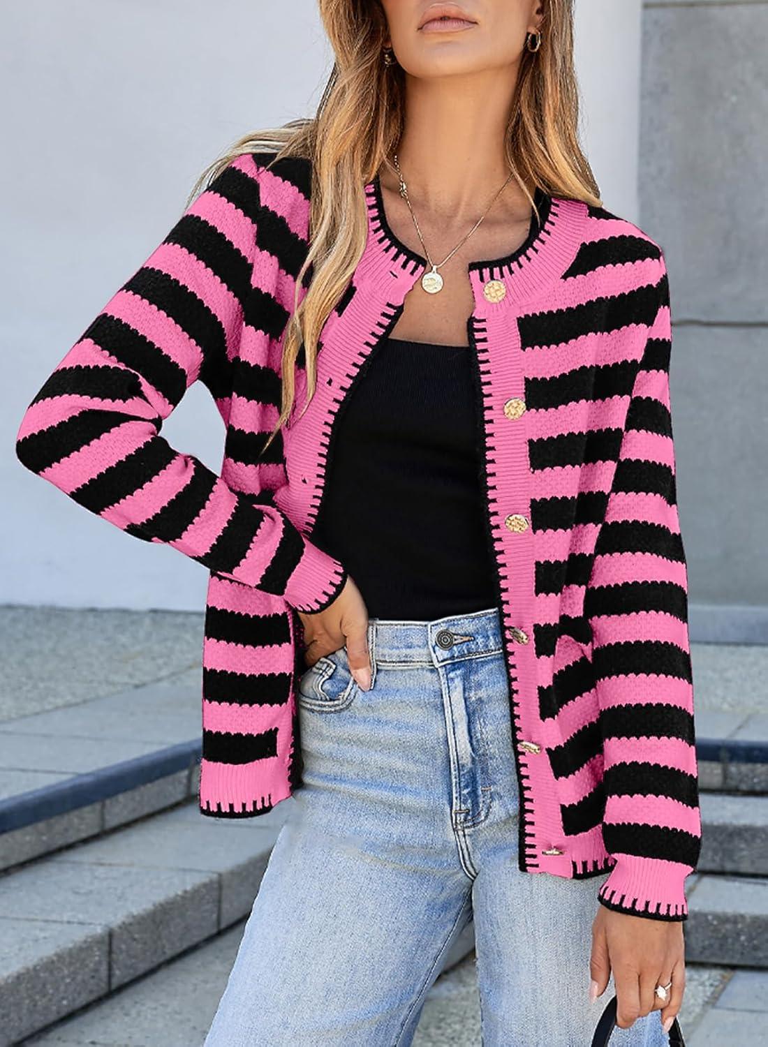 Sidefeel Women’s Cardigan Sweaters Striped Open Front Button Down Knitted Coat Cropped Fall Fashion Outwear(Pink Stripe)