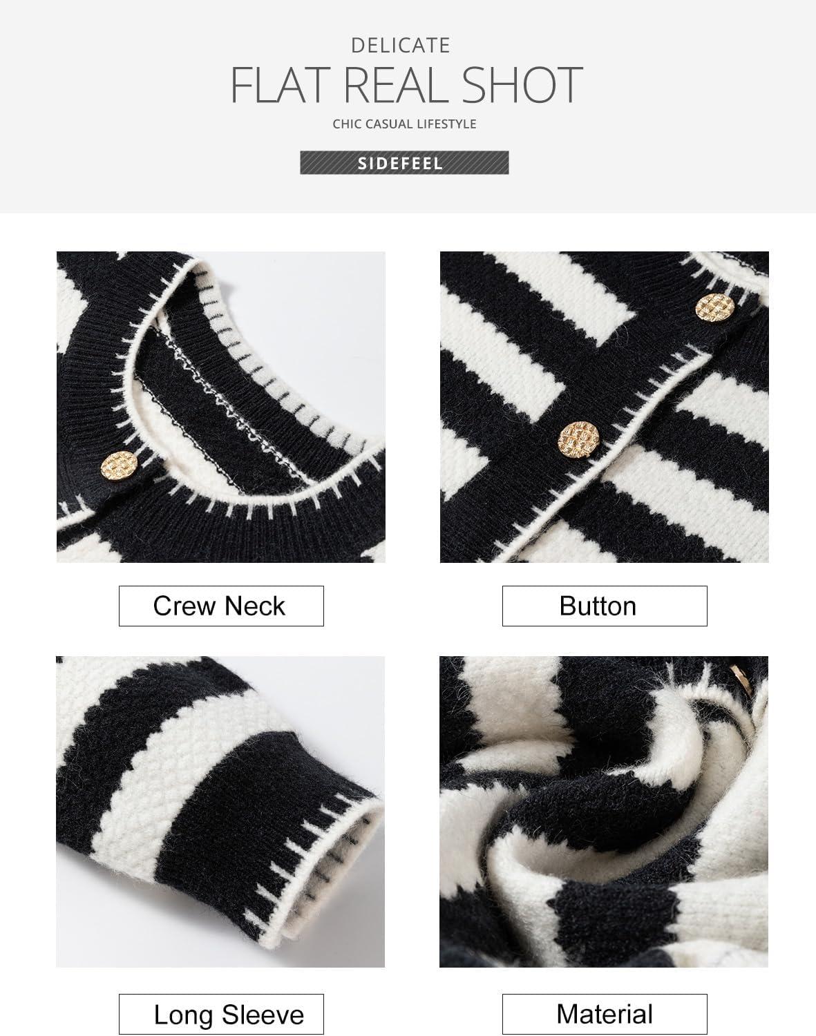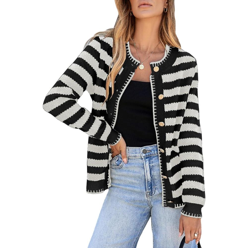 Sidefeel Women’s Cardigan Sweaters Striped Open Front Button Down Knitted Coat Cropped Fall Fashion Outwear(White Stripe)