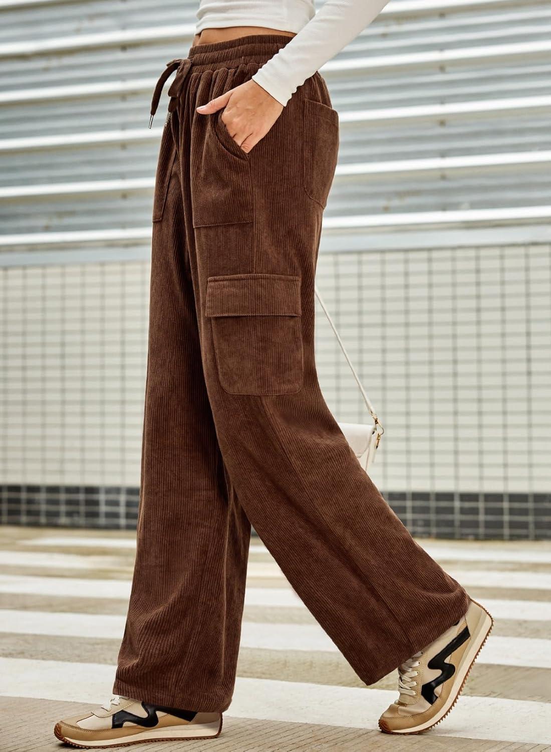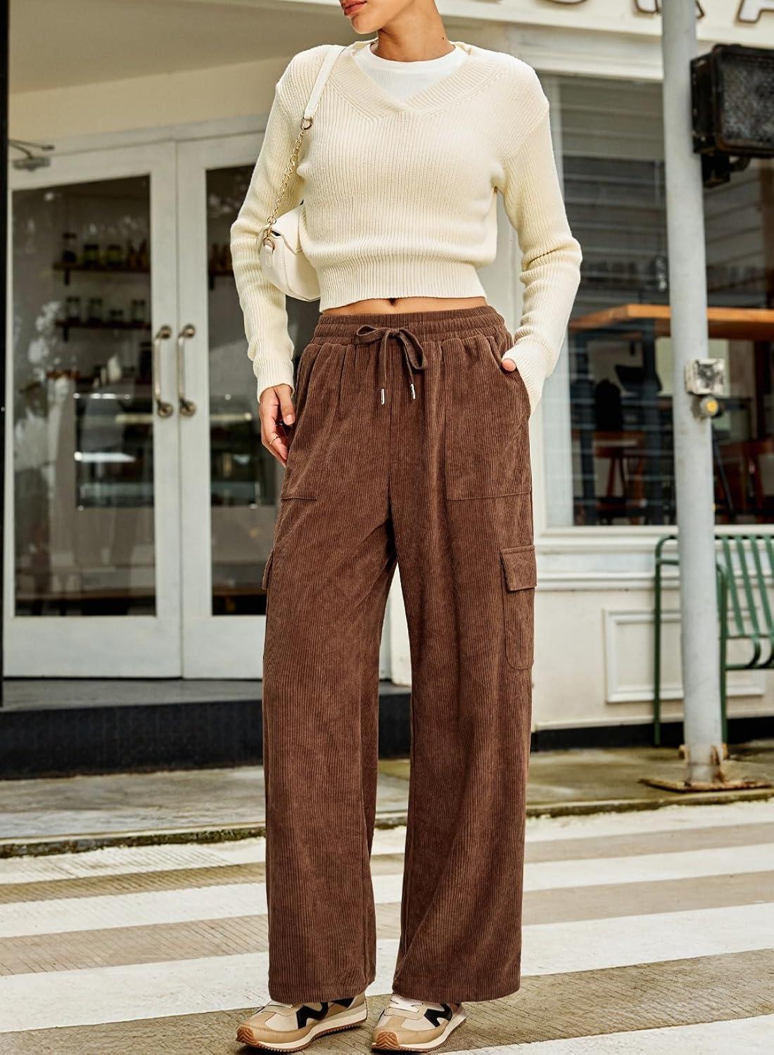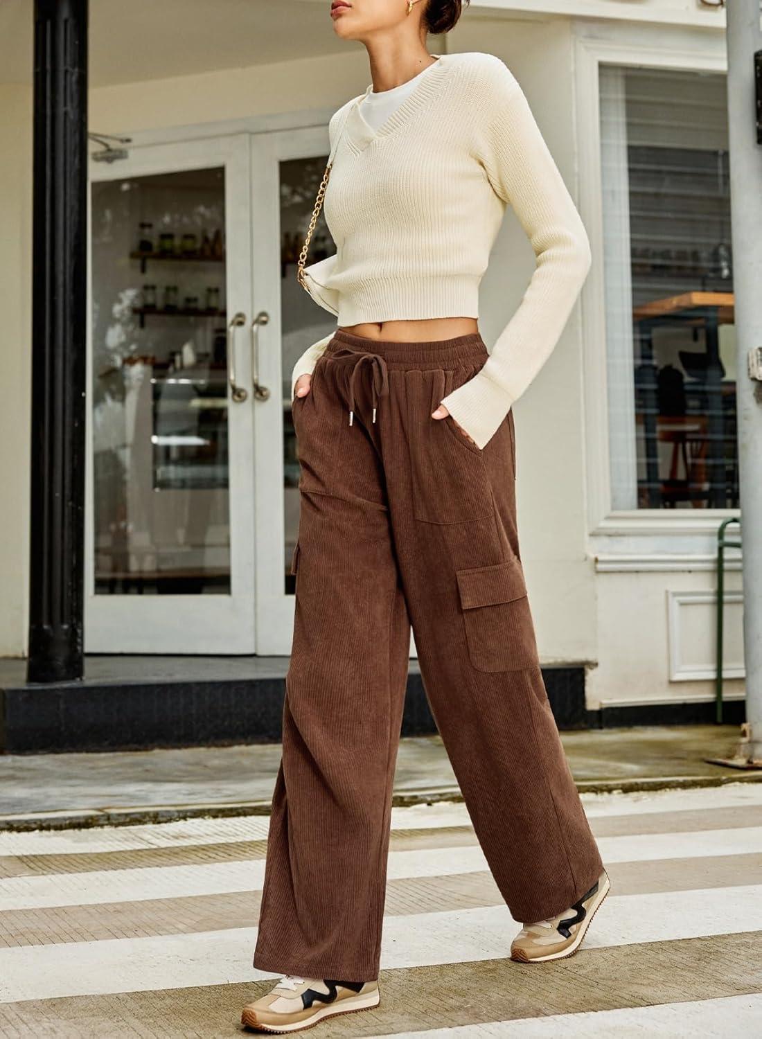 Sidefeel Womens Corduroy Pants Casual High Waisted Elastic Drawstring Cargo Loose Fit Wide Leg Pants with Pockets(Brown)