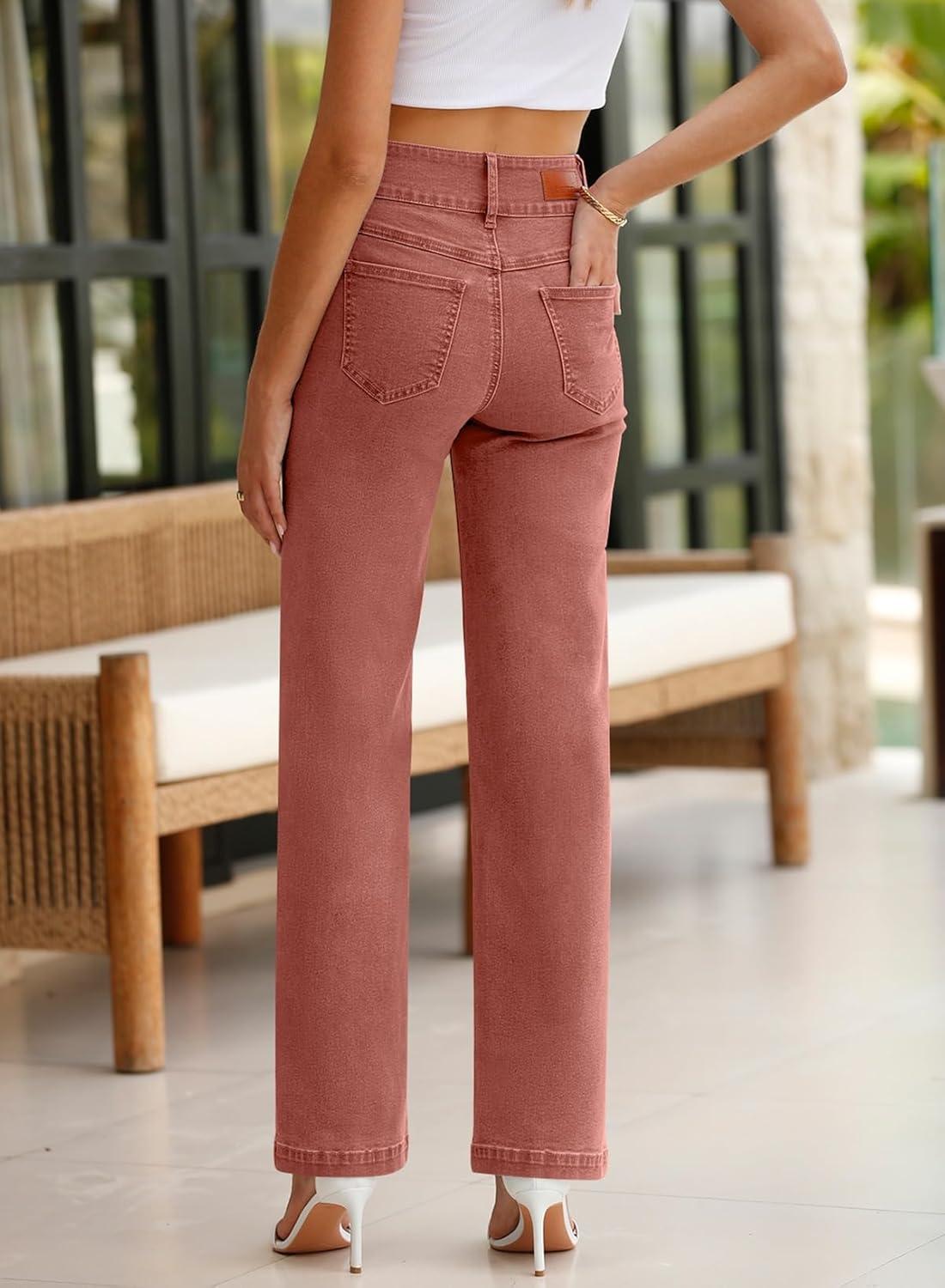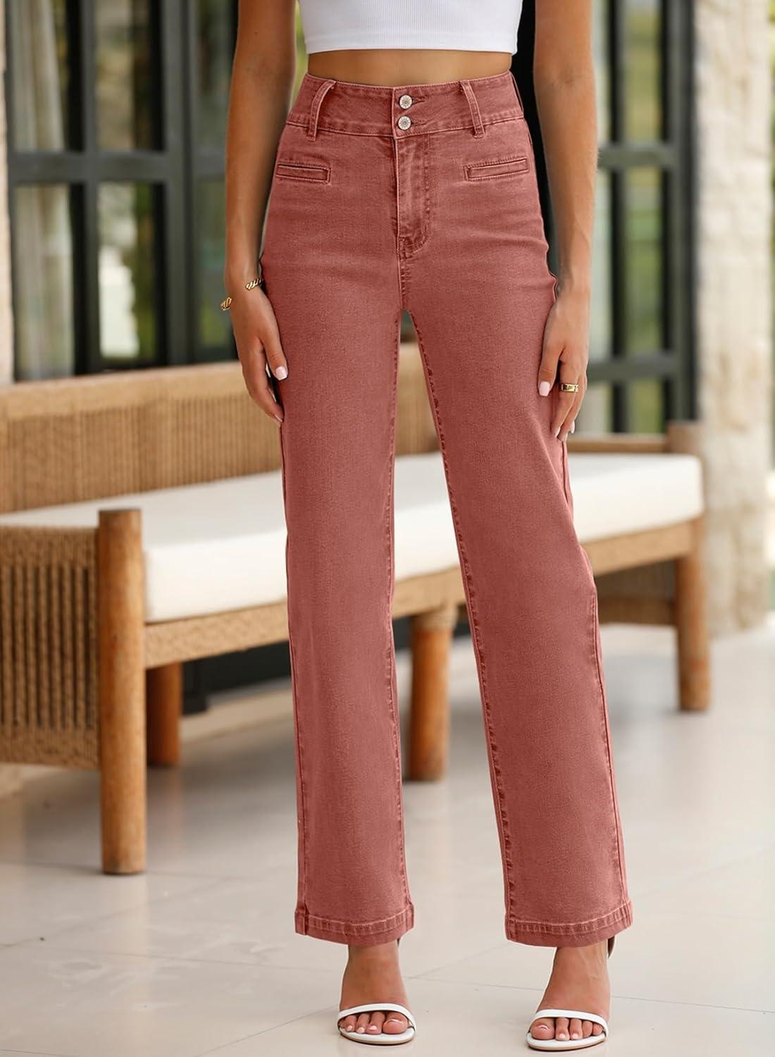 Sidefeel Women’s Jeans High Waisted Straight Leg Stretchy Jeans Trendy Welt Pockets Loose Wide Leg Zimbaplatinum Denim Pants(Mineral Red)