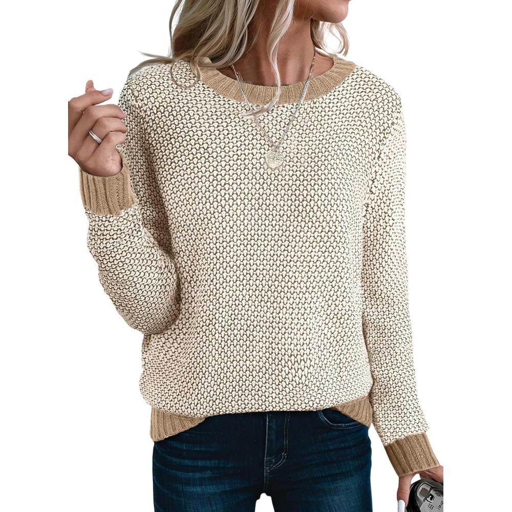 Sidefeel Women’s Long Sleeve Pullover Sweaters Casual Crewneck Chunky Knit Color Block Jumper Tops(Apricot)