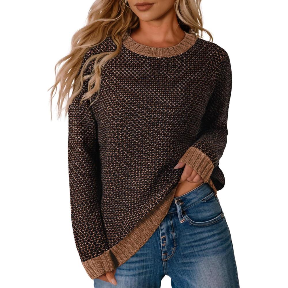 Sidefeel Women’s Long Sleeve Pullover Sweaters Casual Crewneck Chunky Knit Color Block Jumper Tops(Chestnut)