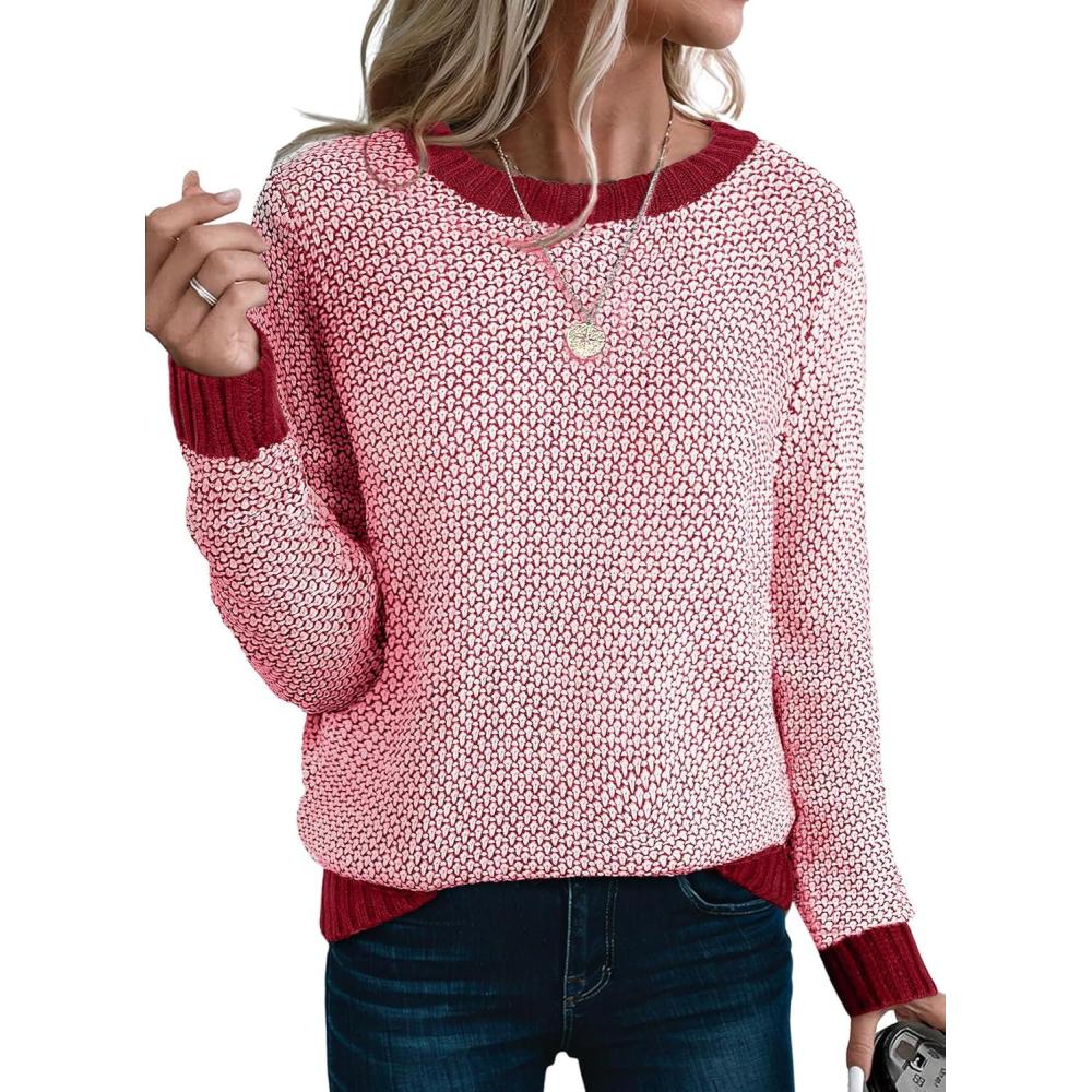 Sidefeel Women’s Long Sleeve Pullover Sweaters Casual Crewneck Chunky Knit Color Block Jumper Tops(Red Dahlia)