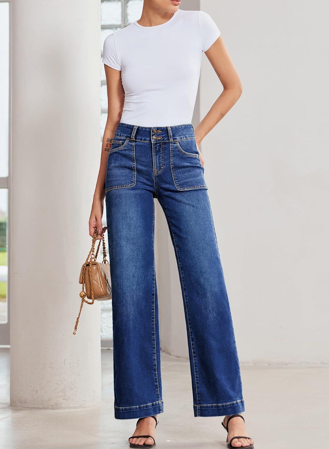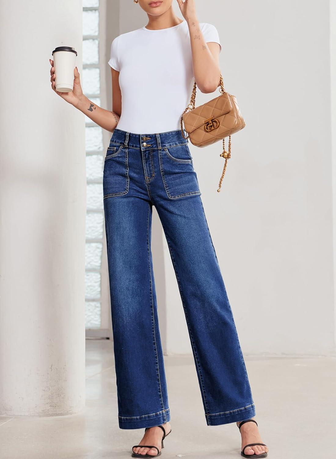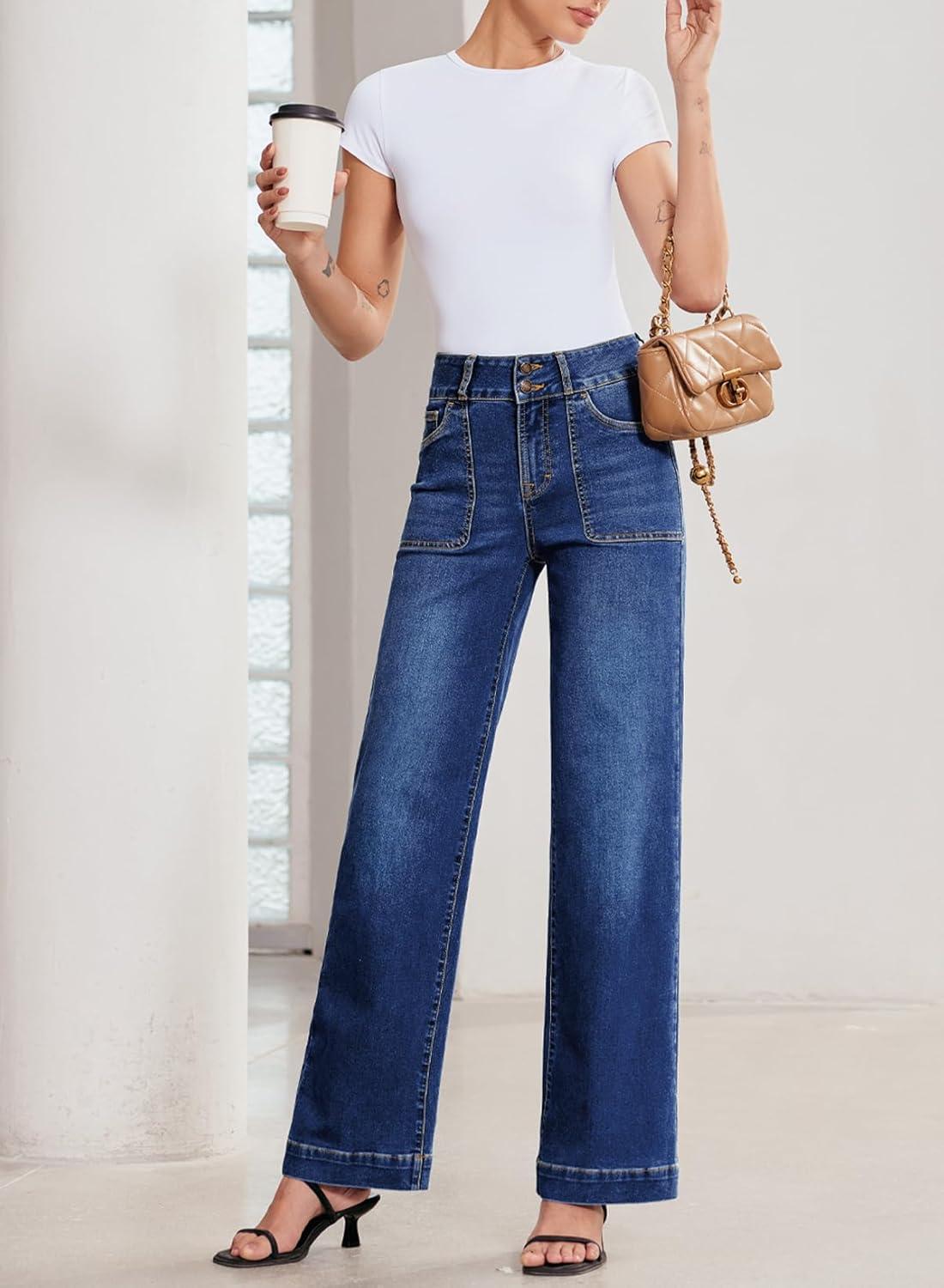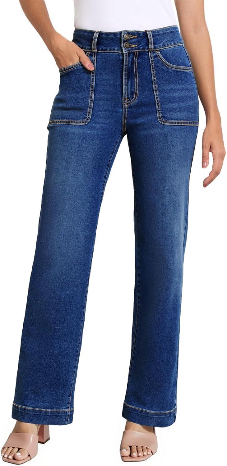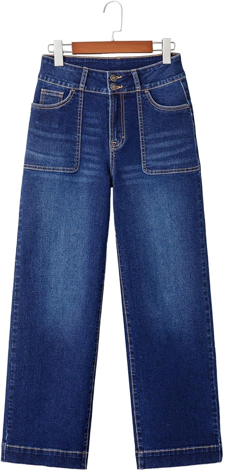 Sidefeel Women’s Straight Leg Jeans High Waisted Stretchy Tummy Control Wide Leg Denim Pants Fall Outfits(Dark Blue)