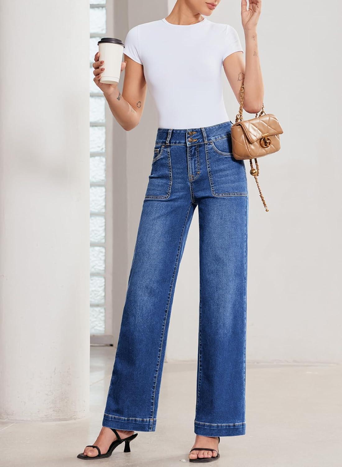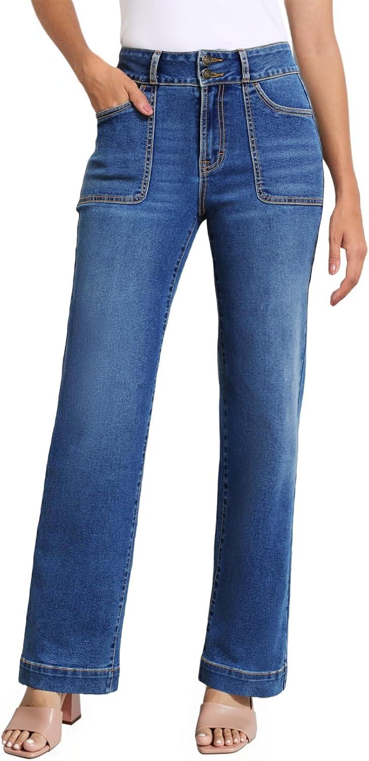 Sidefeel Women’s Straight Leg Jeans High Waisted Stretchy Tummy Control Wide Leg Denim Pants Fall Outfits(Bluing)