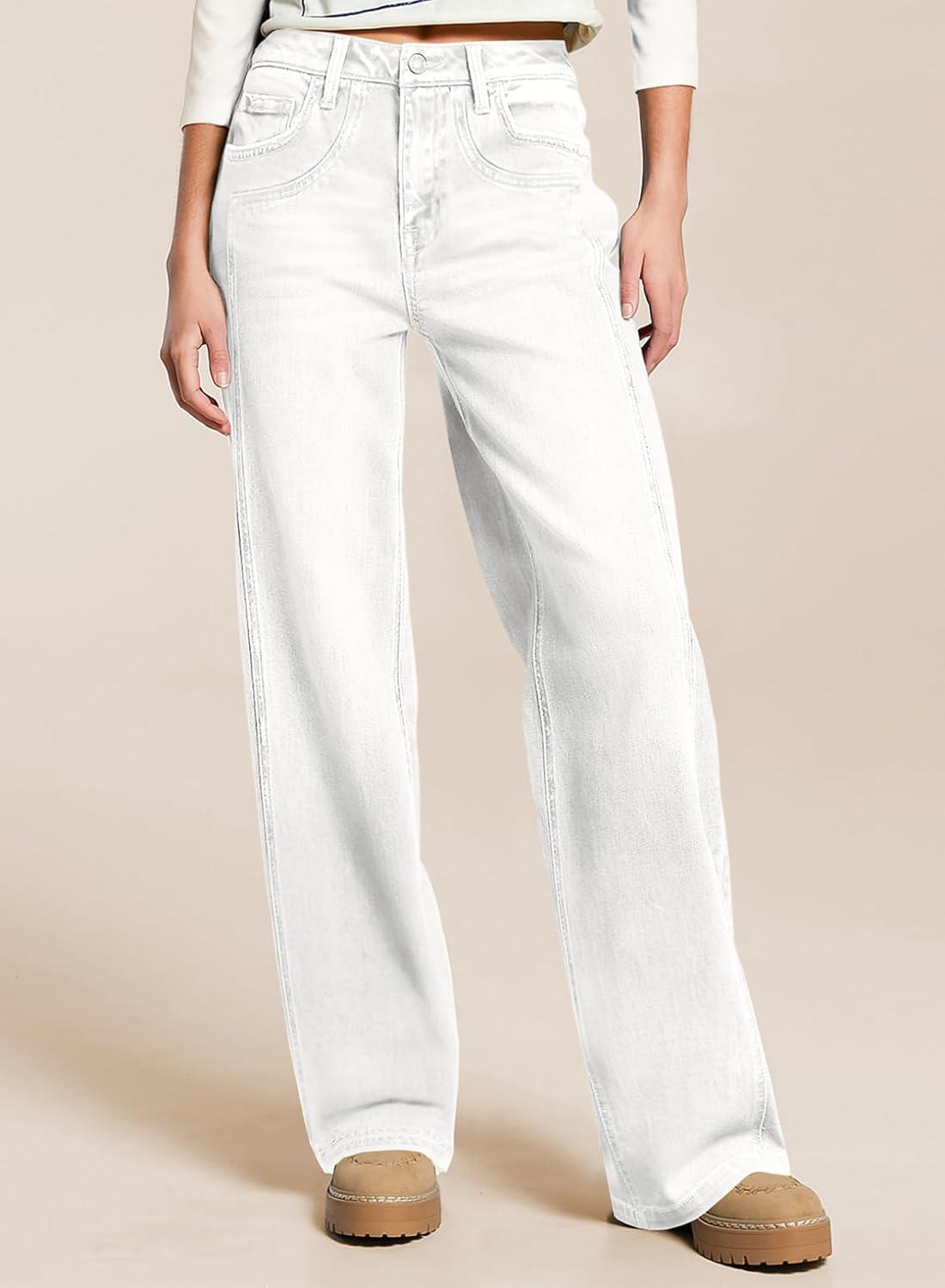 Sidefeel Women’s Wide Leg Jeans High Waisted Stretchy Jeans Straight Leg Trendy Patchwork Loose Fit Denim Pants(White)