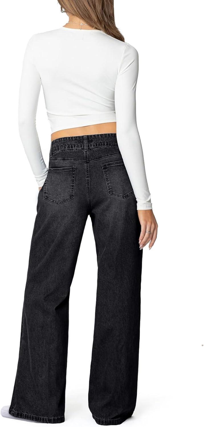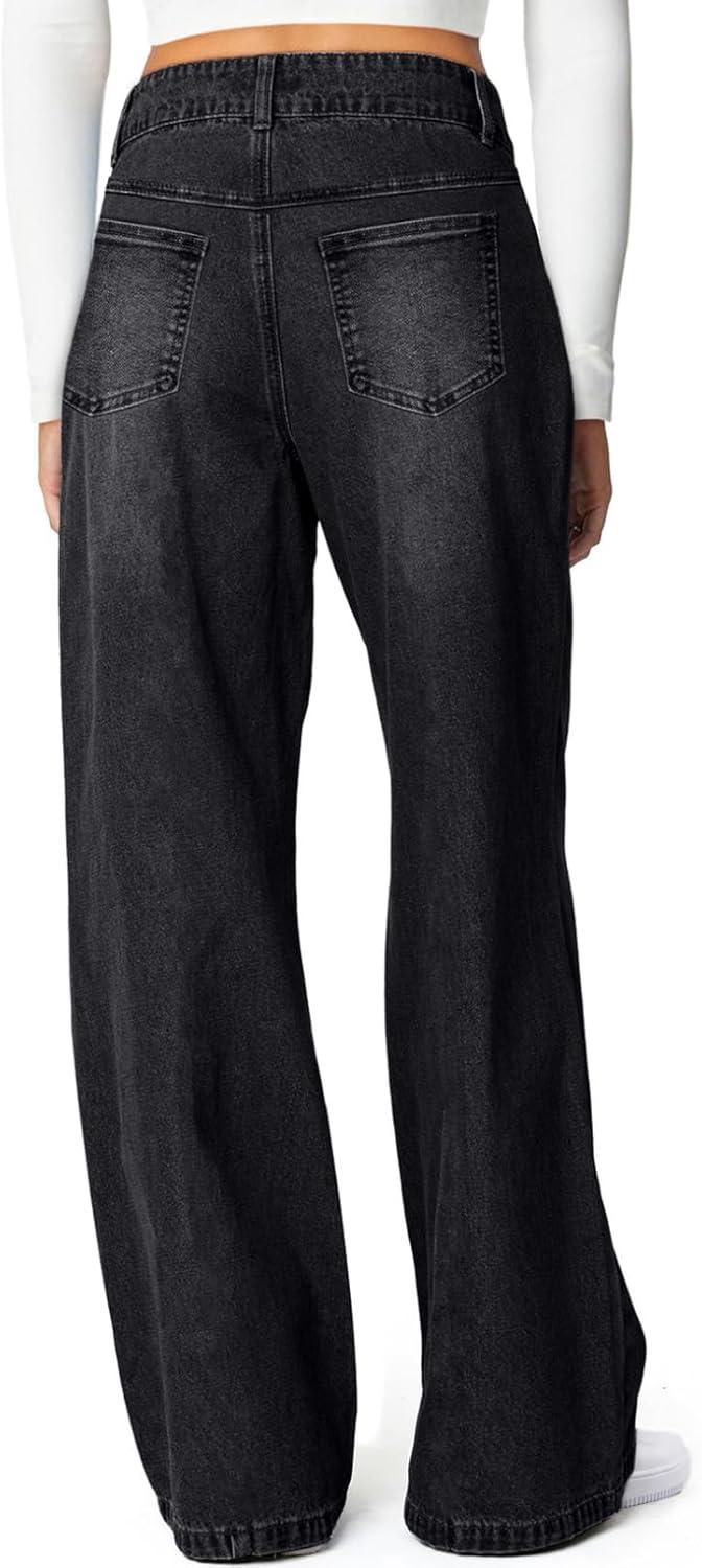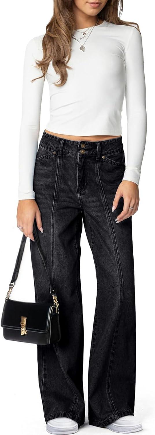 Sidefeel Women’s Wide Leg Jeans High Waisted Stretchy Straight Leg Jeans Trendy Seamed Front Loose Denim Pants(Black)