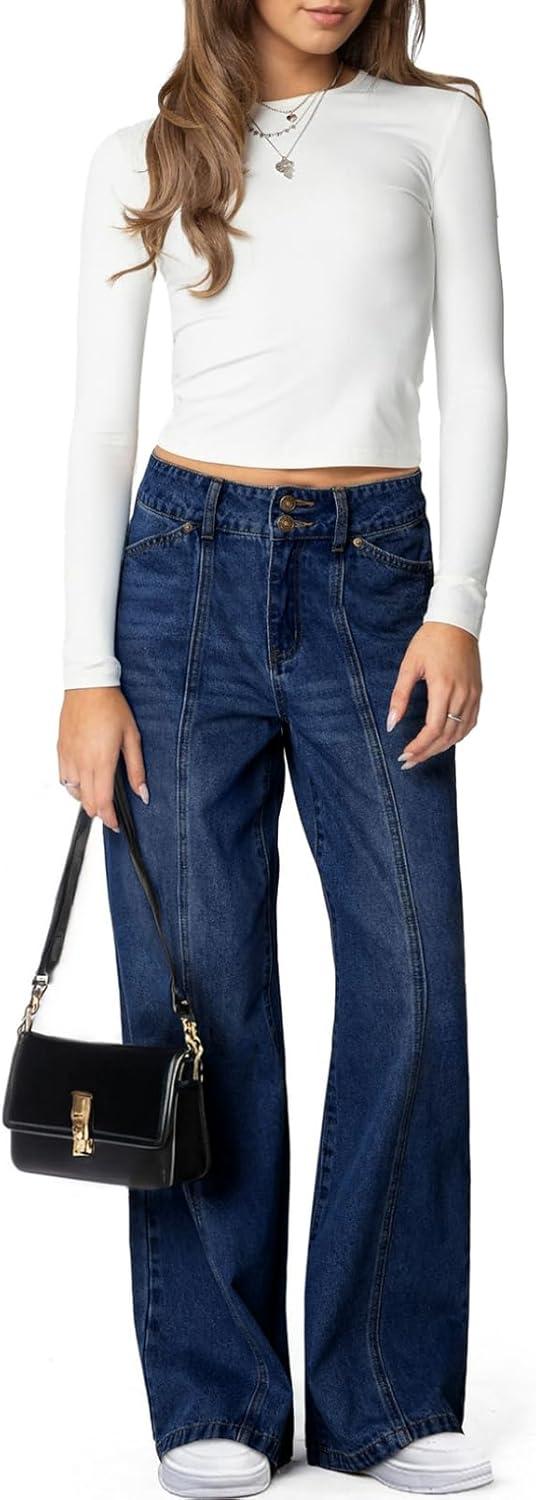 Sidefeel Women’s Wide Leg Jeans High Waisted Stretchy Straight Leg Jeans Trendy Seamed Front Loose Denim Pants(Bluing)