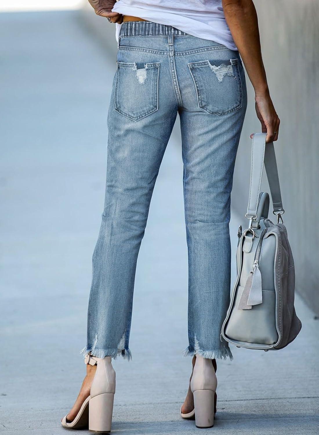 Sidefeel Women’s Zimbaplatinum Drawstring Jeans High Waisted Ripped Boyfriend Pull On Denim Joggers Trousers(Y1 Blue)